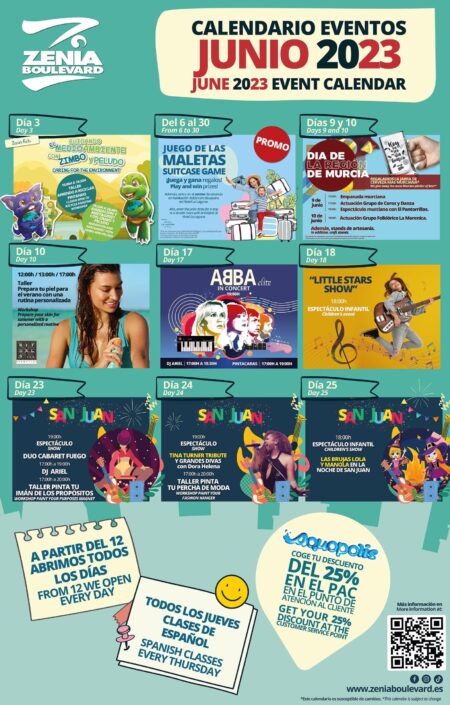 ¡Ven y descubre por qué somos el destino perfecto para tus vacaciones! PROMO MENSUAL - EL JUEGO DE LAS MALETAS Sabemos que el verano es sinónimo de viajes y aventuras, y queremos acompañarte en tus vacaciones. Durante todo el mes de junio, por cada ticket de compra igual o superior a 20€, te regalaremos uno de nuestros fabulosos regalos de viaje. Podrás llevarte un kit de viaje con almohadilla para el cuello, antifaz y tapones de oído, una mochila plegable perfecta para tus escapadas o una práctica bolsa porta documentos de viaje. ¡Prepárate para tus vacaciones con estilo! DÍA DE LA REGIÓN DE MURCIA El 9 y 10 de junio, queremos celebrar el Día de la Región de Murcia junto a todos los murcianos. Si eres socio de nuestro Club de Fidelidad o te unes a él durante estos días, recibirás un regalo muy especial: una divertidísima jarra de cerveza que te hará ser la envidia de tus amigos. Además, en Zenia Boulevard tendremos una programación especial para que disfrutes al máximo de esta festividad, con stands de artesanía y muchas sorpresas murcianas. ¡Acho! CUIDA TU PIEL ¡Prepárate para el verano con un Workshop Gratuito sobre el Cuidado de la Piel de la mano de Rituals en Zenia Boulevard!Sabemos lo importante que es lucir una piel radiante durante la temporada estival, y por eso te invitamos a un emocionante taller donde descubrirás los secretos para cuidar tu piel y mantenerla saludable y luminosa.Se llevará a cabo el día 10 de junio en la Plaza de la Lonja del centro comercial Zenia Boulevard. Tendremos tres horarios disponibles: 12:00h, 13:00h y 17:00h. Será una oportunidad única para aprender los mejores consejos y técnicas de la mano de expertos de Rituals.La entrada es gratuita, pero las plazas son limitadas, por lo que te recomendamos reservar tu lugar a través de la página web de Zenia Boulevard. ¡No te quedes sin tu espacio!Reserva tu plaza GRATIS en la web de Zenia Boulevard y únete a nosotros en esta experiencia única para el cuidado de tu piel. ¡Te esperamos con los brazos abiertos! FIESTA DEL VERANO El día 12 de junio, damos la bienvenida al verano abriendo todos los días del mes, y queremos celebrarlo contigo. Hemos preparado una súper fiesta veraniega llena de diversión para toda la familia. Disfruta de la música del DJ Ariel, deja volar tu creatividad con nuestro pintacaras para niños y adultos, y déjate llevar por el increíble tributo a ABBA. Cantemos juntos los éxitos de Mamma Mia, Dancing Queen o Chiquitita. ¡Ven y disfruta de una tarde inolvidable! SAN JUAN En Zenia Boulevard no podíamos dejar de celebrar la Fiesta de San Juan, una festividad muy importante en Alicante. Del 20 al 24 de junio, te invitamos a unirte a nuestras actividades especiales para disfrutar al máximo de esta tradición. El día 23 y 24, podrás disfrutar del DJ Ariel, el Dúo Cabaret Fuego y talleres infantiles. El día 25, no te pierdas el espectáculo infantil de LAS BRUJAS LOLA Y MANOLA en la noche de San Juan. ¡Ven a celebrar con nosotros! DÉJATE LLEVAR En Zenia Boulevard, también nos preocupamos por la sostenibilidad y el cuidado del medio ambiente. Por eso, durante los meses de verano, lanzaremos la campaña "Déjate Llevar" Nos preocupamos por el impacto ambiental de la automoción y queremos contribuir a la reducción de gases de efecto invernadero. Sabemos que el uso excesivo de automóviles contribuye al calentamiento global, por lo que hemos lanzado la plataforma Share My Car.Share My Car es una iniciativa que permite a nuestros empleados compartir sus coches con otros empleados de Zenia. Al compartir los viajes diarios al trabajo, no solo se ahorra dinero en combustible y gastos de mantenimiento, sino que también se reduce la cantidad de vehículos en la carretera, lo que disminuye las emisiones de gases contaminantes.Pero eso no es todo. También queremos recompensar a quienes elijan medios de transporte sostenibles para venir a Zenia Boulevard. Si llegas en bicicleta al centro comercial, podrás llevarte un timbre super divertido como regalo. Queremos fomentar el uso de la bicicleta como una alternativa ecológica y saludable para los desplazamientos diarios.Además, si decides llegar en autobús y presentas tu ticket en el Punto de Atención al Cliente (PAC), entrarás automáticamente en el sorteo de una tarjeta de regalo de 200€. Queremos premiar y reconocer tu elección de utilizar el transporte público, una opción amigable con el medio ambiente.En Zenia Boulevard, creemos en la importancia de cuidar nuestro planeta y tomar medidas concretas para reducir nuestra huella ecológica. Invitamos a todos nuestros visitantes y empleados a unirse a nosotros en esta causa, adoptando hábitos de movilidad sostenible y eligiendo opciones más amigables con el medio ambiente.¡Ven a Zenia Boulevard este mes de junio y disfruta de todas nuestras promociones, eventos y actividades especiales! Estamos comprometidos con brindarte una experiencia única.